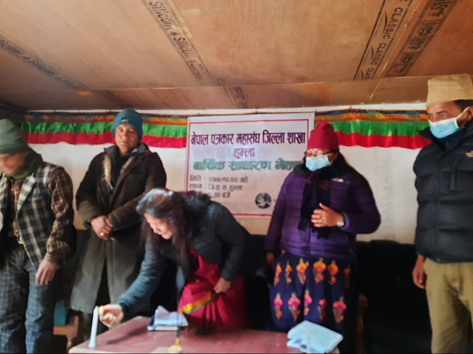 नेपाल पत्रकार महाँसघ जिल्ला शाखा हुम्लाका वरिष्ठ उपाध्यक्ष मधु बस्नेत शाहीको अध्यक्षता र नेपाल पत्रकार महासंघका केन्द्रिय प्रतिनिधि एव सचिव लक्ष्मी पुनको प्रमुख आतिथ्यमा बार्षिक साधारण सभा भेला संचालन भएको छ ।